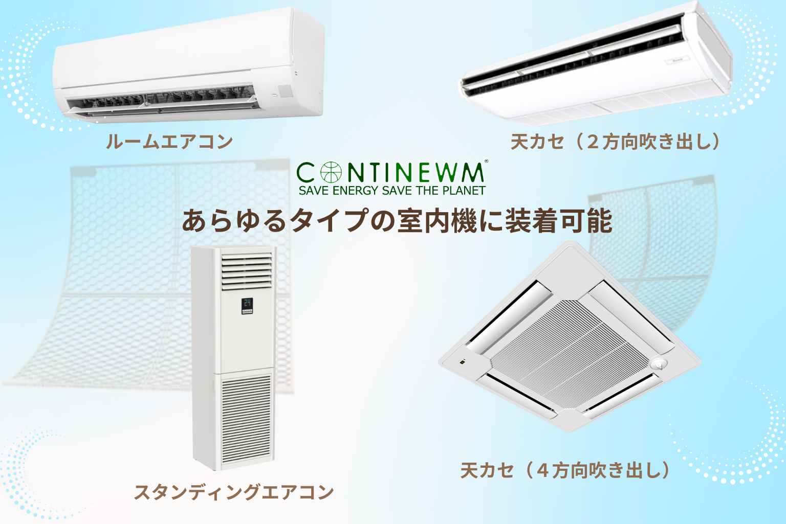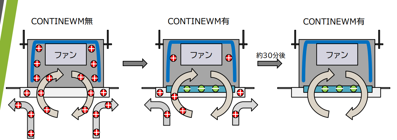 常にマイナスに帯電しているCONTINEWMはプラスの電荷発生を抑え、 無電荷状態の空気に変えます。このことで、エアコンは静電気の影響を受けず、 本来意図していた熱交換効率を発揮することができます。