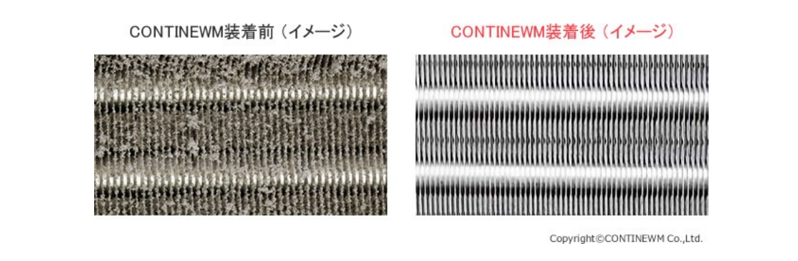 空気中に漂っているホコリは、ほとんどが静電気を帯びていて、帯電している物質にくっつきます。 ホコリがエアコンに吸い込まれると、空気との摩擦によって帯電している熱交換器(フィン)に付着し、溜まって いきます。(左図) これが、熱交換効率悪化の原因となります。 ところが、CONTINEWM装着後はフィンが帯電しないためホコリが付着しにくくなります。(右図) したがって、エアコンは本来意図していた熱交換効率を発揮でき、消費電力の削減につながります。