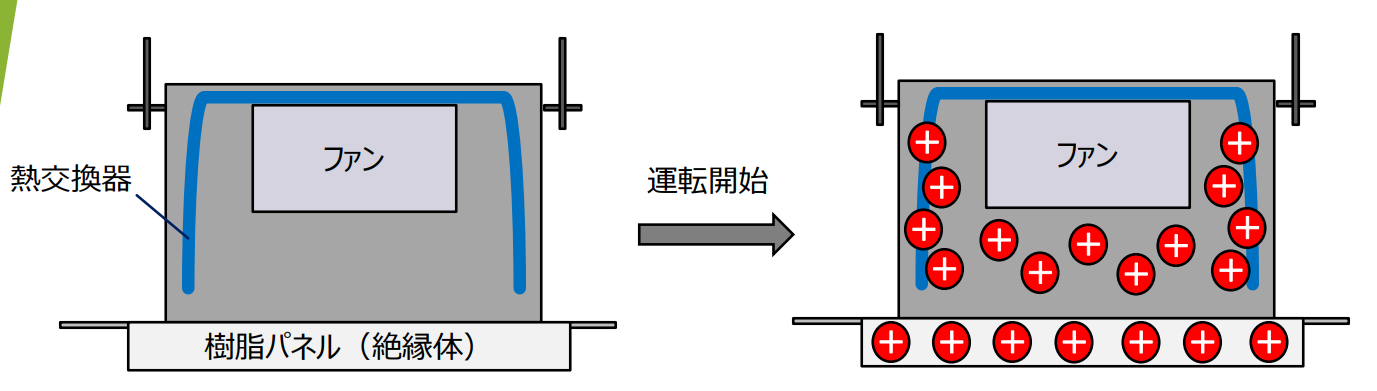 エアコン内の熱交換器(フィン)および樹脂製パネル(絶縁体)は、 ファンの回転に伴う空気との摩擦により静電気が発生し、プラスに帯電しています。 エアコンが帯電すると、空気の流れが本来意図していたものにならず、 熱交換効率が低下します。